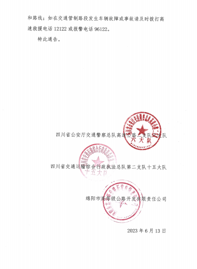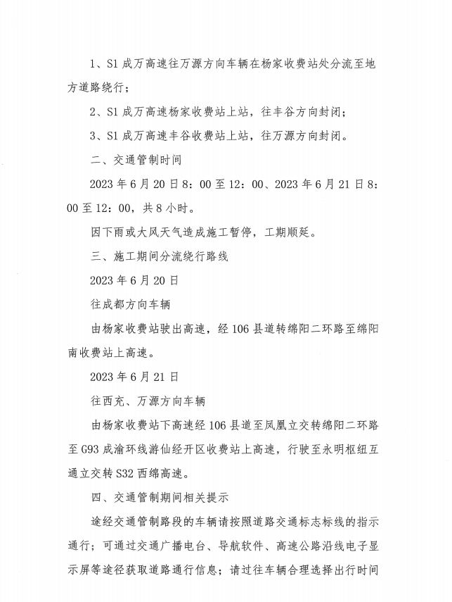 關(guān)于S1成萬高速磨家至永明段實行交通管制的通告