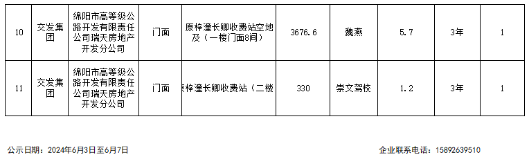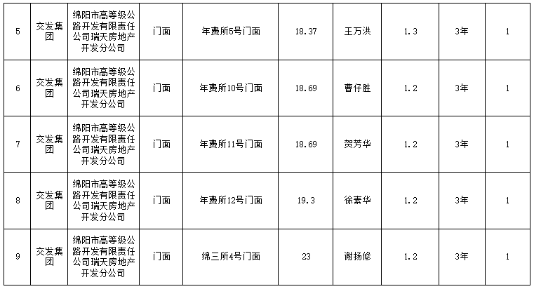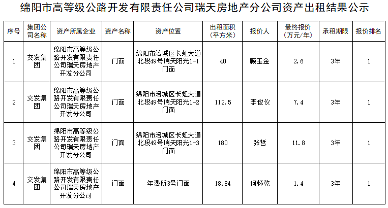 綿陽市高等級(jí)公路開發(fā)有限責(zé)任公司瑞天房地產(chǎn)分公司資產(chǎn)出租結(jié)果公示